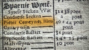 The oldest Spanish mention of the grape dates back to 1618. A text by the Spanish writer Vicente Espinel talks of a famous Pedro Ximénez de Malaga wine. However an even older reference was discovered in The Netherlands. Just a few years ago Mariella Beukers (in her book Wijnkronieken) discovered a pricelist used in the Amsterdam wine market in 1609. Surprisingly, this already mentions a wine called Pieter Cemeynes (image to the right). Another document from 1628 mentions Pieters Semeijnen as the best wine in a Rotterdam cellar. Dutch writers believe they can link the grape to Pieter Symonsz, a trader from Rotterdam who travelled to Cordoba around 1600.